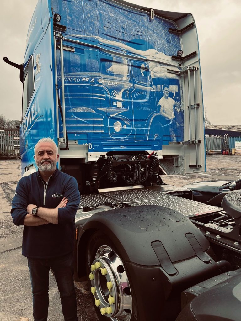 Nicknamed ‘The Guv’nor’ after company forefather and inspiration John McLellan Senior, the truck features a picture of John with his first truck at Connal & Co from 1969 and son Gordon across the rear of DAF’s huge cab. Gordon subsequently joined the transport industry and ultimately set up McLellan’s Transport, the forerunner of Keedwell Scotland, in 1985.